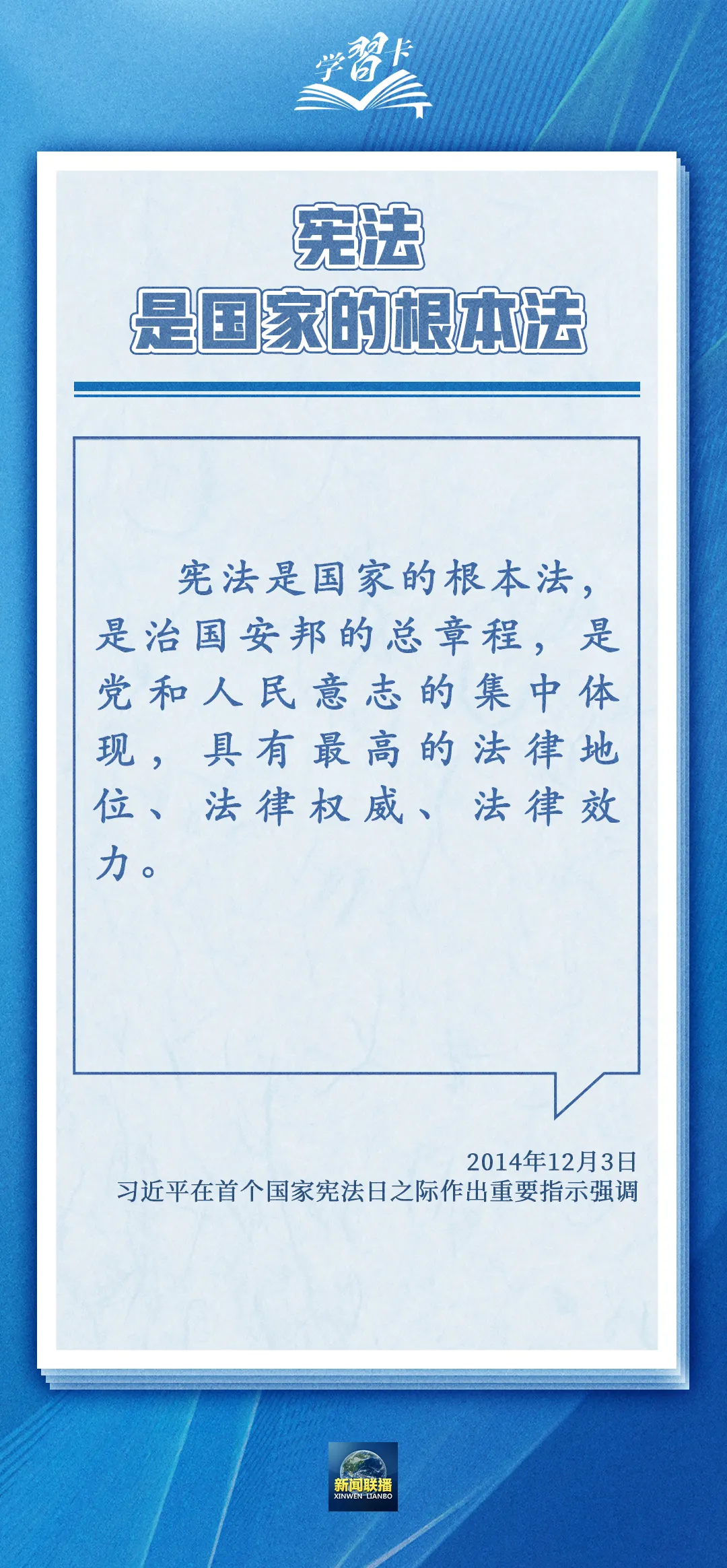 2024年12月4日是第11個(gè)國家憲法日。憲法與國家前途、人民命運(yùn)息息相關(guān)。圍繞依憲治國、依憲執(zhí)政,習(xí)近平總書記多次在不同場合強(qiáng)調(diào),憲法是黨和人民意志的集中體現(xiàn),豐富和發(fā)展了中國特色社會主義法治理論,也為推進(jìn)國家治理體系和治理能力現(xiàn)代化指明了根本路徑和努力方向。一起學(xué)習(xí)——