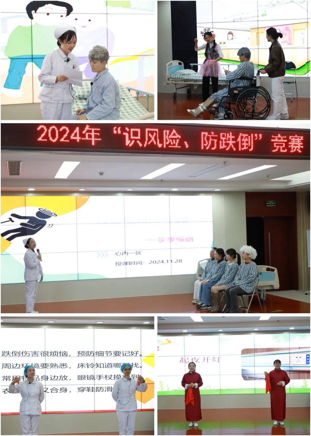 在競賽中,各參賽團(tuán)隊(duì)通過情景劇、短視頻、快板和脫口秀等多種形式,生動(dòng)展示了防跌倒護(hù)理的專業(yè)技能與創(chuàng)新思維。這些表演不僅涵蓋了跌倒風(fēng)險(xiǎn)評估的多維度考量(如患者年齡、身體狀況、藥物影響)和預(yù)防措施(如環(huán)境安全設(shè)計(jì)、健康教育),還揭示了日常工作中容易忽視的細(xì)節(jié)問題,為日后護(hù)理工作的改進(jìn)提供了經(jīng)驗(yàn)教訓(xùn)。