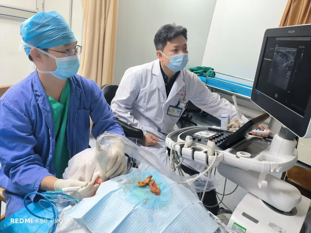 1.微創(chuàng)美容:微波消融術(shù)通過皮膚穿刺針進(jìn)行治療,只在皮膚上留下針眼,不會留下明顯瘢痕,而傳統(tǒng)手術(shù)需要開刀,體表會有瘢痕,損傷相對較大。2.快速恢復(fù):微波消融術(shù)的手術(shù)時間較短,通常在15到30分鐘之間,患者可以在術(shù)后短時間內(nèi)出院,恢復(fù)快,不影響日常生活。3.保留甲狀腺功能:微波消融術(shù)只針對目標(biāo)結(jié)節(jié)進(jìn)行消融,對周圍正常甲狀腺組織幾乎無損,一般不會影響甲狀腺功能,患者術(shù)后通常不需要終身服用甲狀腺素片。4.安全性高:微波消融術(shù)在局部麻醉下即可完成,避免了全身麻醉的風(fēng)險,術(shù)中出血量少,減少了術(shù)中和術(shù)后的并發(fā)癥風(fēng)險。5.療效確切:微波消融術(shù)通過高溫使結(jié)節(jié)組織壞死,治療效果可以媲美傳統(tǒng)開刀手術(shù)。6.住院時間短:患者行微波消融術(shù)后一般觀察幾小時或者一晚上,無不良反應(yīng)即可離開醫(yī)院,住院時間短。甲狀腺外科蔣富兵主任醫(yī)師及超聲科黃劍毅主任醫(yī)師在為患者行微波消融術(shù)