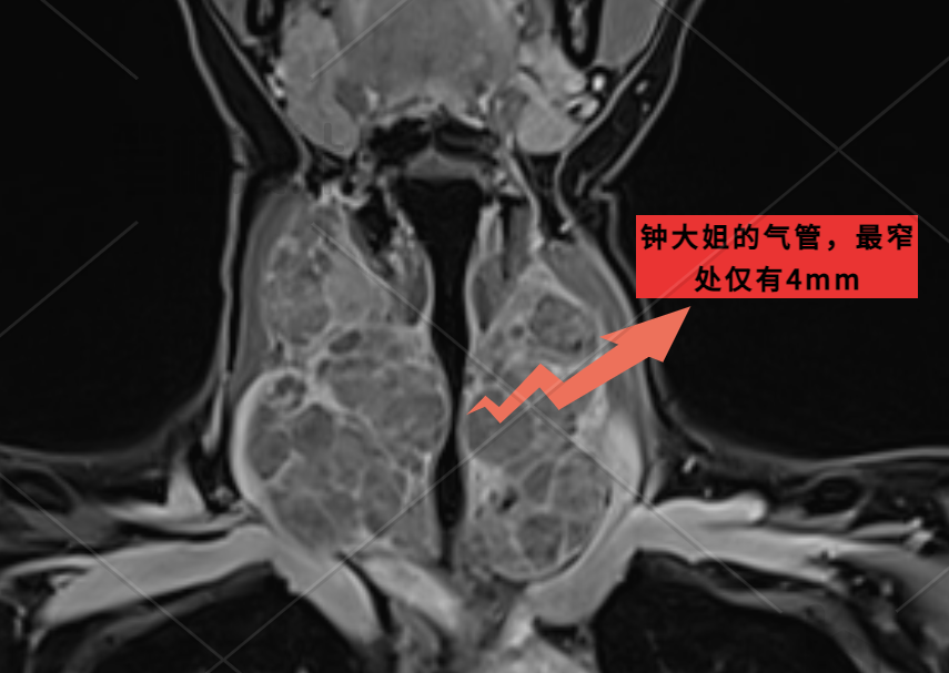 腫瘤巨大,而且壓迫整個(gè)氣管。長(zhǎng)達(dá)十幾年的壓迫,可能導(dǎo)致氣管軟化,一旦切除腫瘤,氣管就有塌陷可能,立馬就有造成窒息的風(fēng)險(xiǎn)。