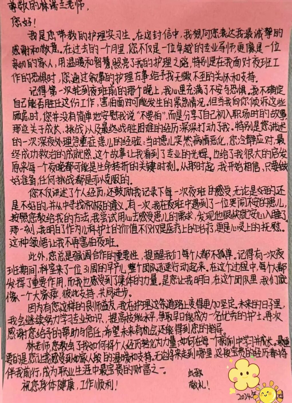 信中深情講述了帶教護(hù)士林諾蘭與其學(xué)生之間的深厚情誼和寶貴的成長(zhǎng)經(jīng)歷,更展現(xiàn)了新生兒科獨(dú)特?cái)⑹伦o(hù)理文化和視同事如家人的“家文化”理念。