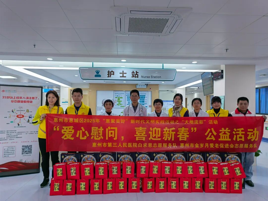 2025年1月14 日,一場洋溢著溫暖與關(guān)愛的公益活動(dòng)在惠州市第三人民醫(yī)院神經(jīng)內(nèi)科一區(qū)溫情上演。此次活動(dòng)由惠州市第三人民醫(yī)院白求恩志愿服務(wù)隊(duì)攜手惠州市金歲月愛老促進(jìn)會(huì)共同舉辦,是惠州市惠城區(qū)2025年 “惠聚美好” 新時(shí)代文明實(shí)踐活動(dòng)之 “大地流彩” 系列中 “愛心慰問,喜迎新春” 的重要公益活動(dòng)。