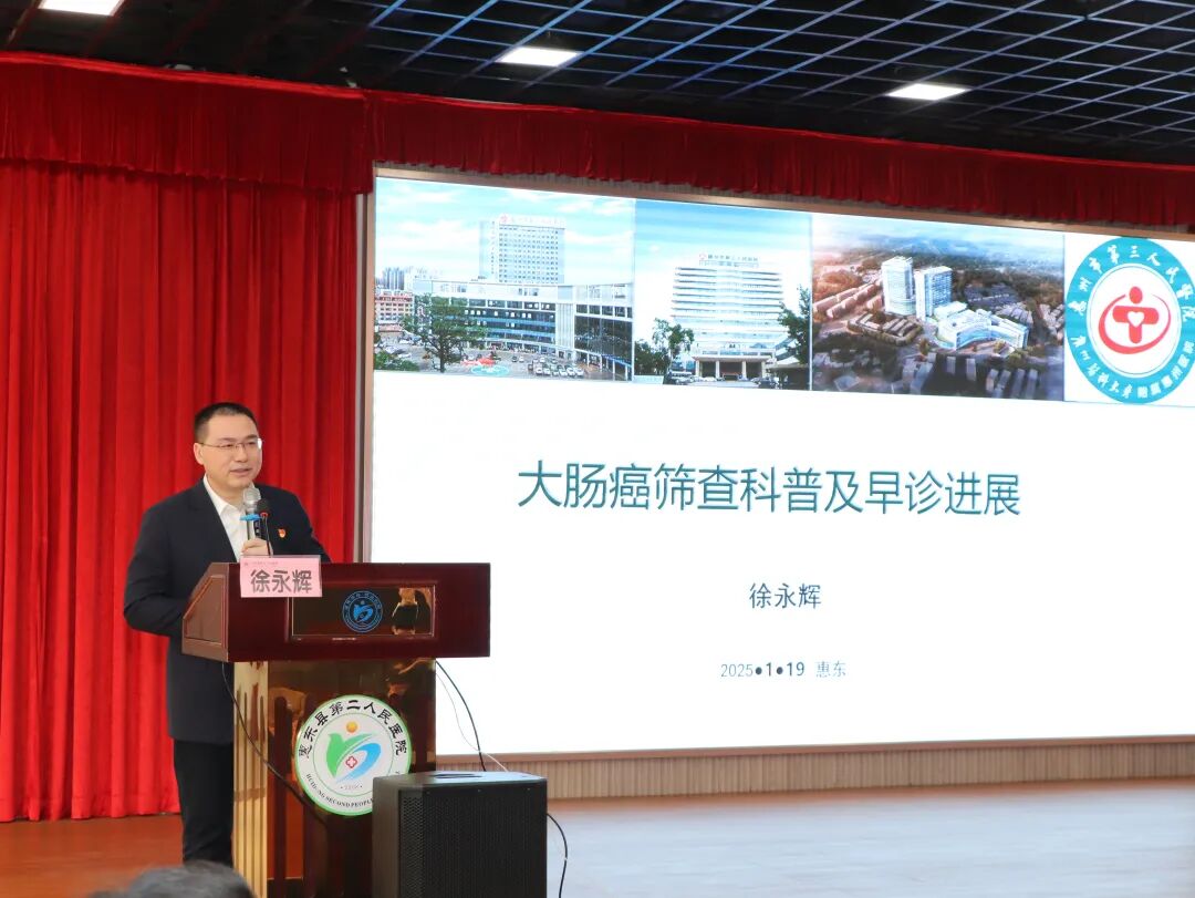 惠州市第三人民醫(yī)院消化醫(yī)學中心一黨支部書記徐永輝講授有關大腸癌的科普講座,介紹大腸癌的流行病學、預防、早期癥狀、診斷方法及治療手段等知識,提高黨員和群眾對大腸癌的認識,增強健康意識和自我保健能力 。