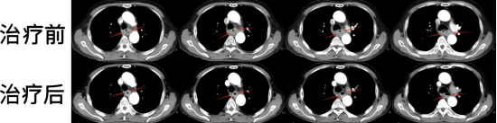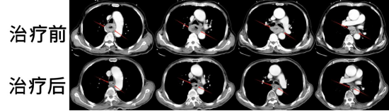 圖注:胸部CT掃描治療前后比對。上排為治療前,可見食管癌偏心病灶,增厚的食管腫瘤病灶阻塞食管;下排為治療后,食管癌病灶縮退,食管形態(tài)基本恢復(fù)正常