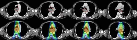 圖注:放射治療靶區(qū)及劑量分布圖,上排為治療前,可見食管癌環(huán)周病灶,食管腔變窄;紅色線包繞區(qū)為放療照射靶區(qū)。下排為放療計(jì)劃圖,可見射線照射劑量紅色高劑量區(qū)充分覆蓋靶區(qū),雙肺僅接受少量照射。