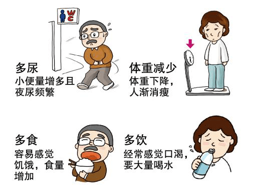 多尿、多飲、多食、體重下降,通常稱為“三多一少”。