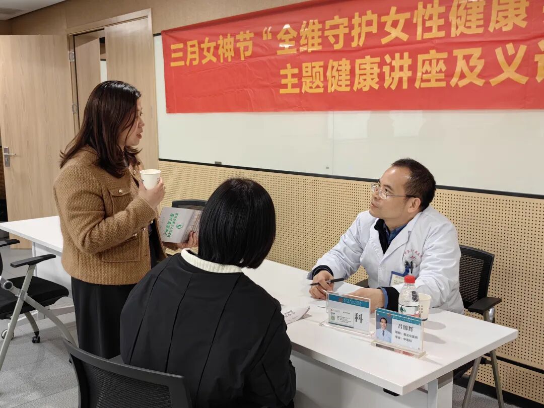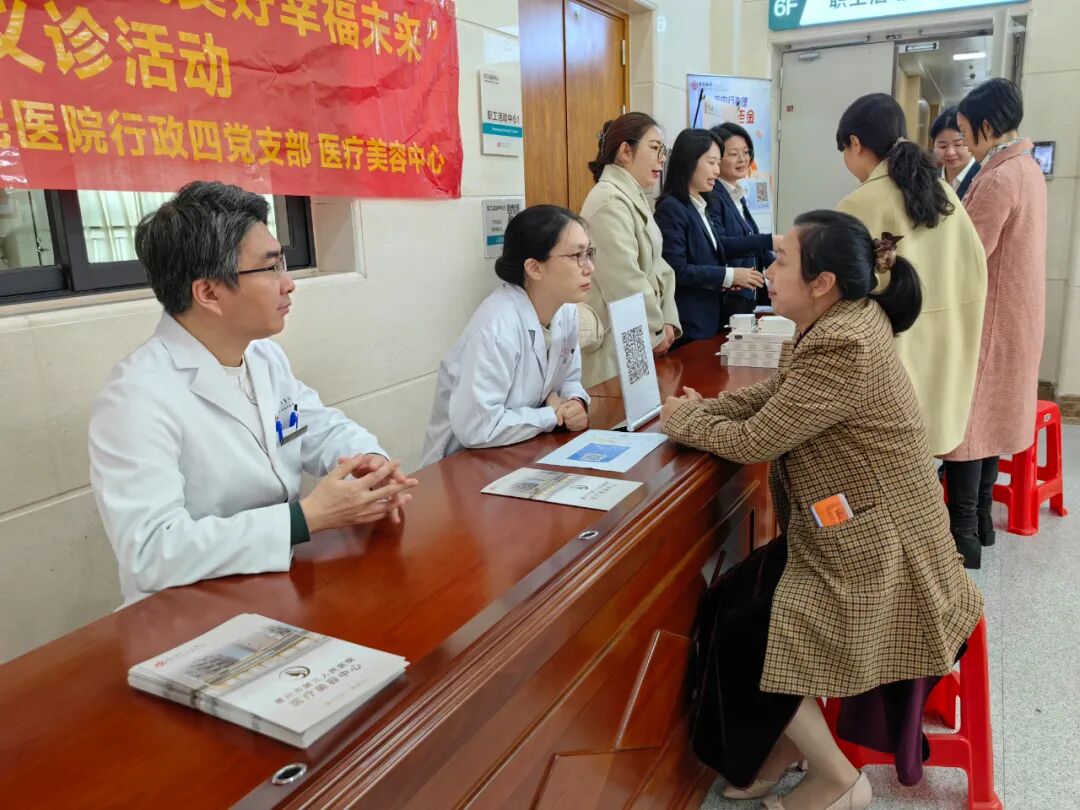 講座結(jié)束后,義診環(huán)節(jié)更是將活動(dòng)推向了高潮。石云主任親自為女性朋友們提供美容咨詢服務(wù),耐心解答關(guān)于皮膚護(hù)理、抗衰老等問題;營養(yǎng)科孫玥主任則為有慢性病困擾的女性提供了專業(yè)的健康管理建議,并結(jié)合體檢報(bào)告給出了個(gè)性化的飲食與生活方式指導(dǎo);特診中心呂錦輝副主任中醫(yī)師通過把脈問診,為多位女性開具了調(diào)理體質(zhì)的中藥方;美容外科王存富醫(yī)生和美容皮膚科黃影醫(yī)生則分別提供了微整形咨詢和皮膚診療服務(wù)。此外,醫(yī)院門診黨支部嚴(yán)茂霞護(hù)士長和行政四黨支部周夢玲為現(xiàn)場女同胞們提供了免費(fèi)測血糖、測血壓等服務(wù)。