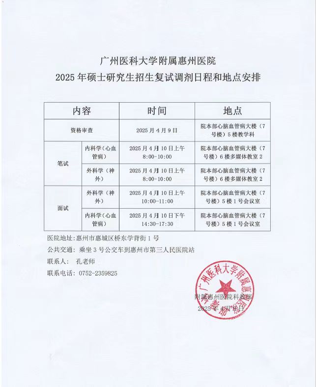 廣州醫(yī)科大學(xué)附屬惠州醫(yī)院2025年碩士研究生招生復(fù)試調(diào)劑日程和地點(diǎn)安排
