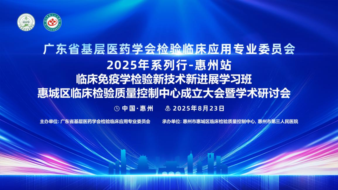 2025年8月23日,廣東省基層醫(yī)藥學會檢驗臨床應用專業(yè)委員會和惠城區(qū)臨床檢驗質量控制中心主辦、惠州市第三人民醫(yī)院承辦的“廣東省基層醫(yī)藥學會檢驗臨床應用專業(yè)委員會2025年系列行——惠州站、臨床免疫學檢驗新技術新進展學習班暨惠城區(qū)臨床檢驗質量控制中心成立大會暨學術研討會”在惠州成功召開。本次會議以“技術引領、質量筑基、區(qū)域協(xié)同”為主題,匯聚多位國內(nèi)外知名專家與基層代表,圍繞檢驗醫(yī)學前沿技術、實驗室質量管理、區(qū)域結果互認與實踐應用等熱點展開深入交流。