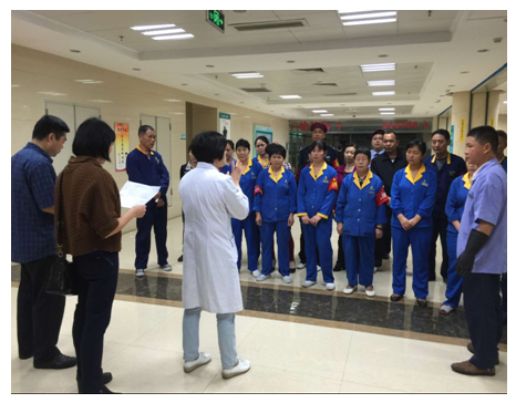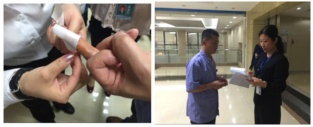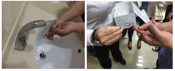演練情景之二:保潔員在處理泄漏的醫(yī)療廢物時不慎被污染針頭扎傷左手中指,并有液體噴濺到眼睛。經(jīng)初步處理后,當事人立即報告部門經(jīng)理,填寫《血 源性職業(yè)暴露個案登記表》,部門經(jīng)理確認后簽字,通過“OA”并打電話報告至院感科,然后再進行評估、預(yù)防用藥等后續(xù)處理。