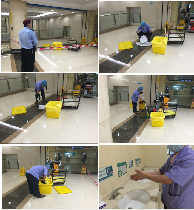 演練情景之一:珠江物業(yè)運送員在清運醫(yī)療垃圾過程中不慎將垃圾灑落。當事人立即報告保潔部門經(jīng)理周玲普,周經(jīng)理到達現(xiàn)場后首先指導保安將現(xiàn)場進行封閉,然后打電話報告后勤主管郭千師,同時請院感部到場進行指導;保潔員***戴好手套、口罩、帽子后,用吸水紙對灑落物進行覆蓋,噴灑2000mg/L含氯消毒溶液作用30min后,將泄露物清除,倒入雙層醫(yī)療垃圾袋內(nèi),之后用1000mg/L含氯消毒溶液進行清潔3次,最后用清水清潔1次;現(xiàn)場處理完畢后,保潔員進行手衛(wèi)生,之后詳細記錄消毒過程。
