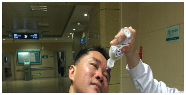 當事人立即摘手套,洗手,用生理鹽水沖洗眼睛及面部10min。