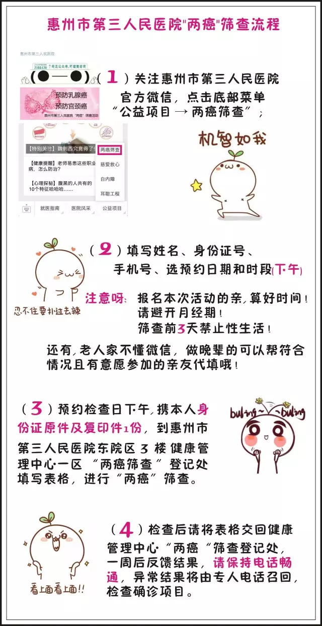 3)預(yù)約檢查日下午攜本人身份證原件及復(fù)印件1份,到惠州市第三人民醫(yī)院東院區(qū)3樓 健康管理中心一區(qū)“兩癌篩查”登記處填寫表格,進(jìn)行“兩癌”篩查。