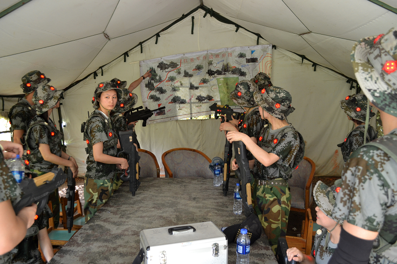 就在第一隊在進(jìn)行“急速60秒”的時候,第二隊學(xué)員在野戰(zhàn)場地開始進(jìn)行“真人CS野戰(zhàn)”活動,教官將第二隊學(xué)員分成了“紅軍”和“藍(lán)軍”2個小隊進(jìn)行叢林對抗賽,第一輪是“殲滅戰(zhàn)”,2個隊伍需要從各自的基地出發(fā)向?qū)Ψ交剡M(jìn)攻,首先殲滅對方隊伍的獲得勝利,戰(zhàn)斗開始前2個隊伍有3分鐘的時間在各自基地商量作戰(zhàn)方案,這個時候就很考量各自隊伍“首長”的個人能力了,如何根據(jù)戰(zhàn)場地形和自己戰(zhàn)士及裝備情況制定合理的作戰(zhàn)方案,如何鼓舞自己的戰(zhàn)士讓他們擁有必勝的信念和對自己隊伍的強(qiáng)烈榮耀感,發(fā)揮每個人每件裝備的特長。戰(zhàn)斗開始,兩隊的戰(zhàn)士們各自占據(jù)有利地形展開激烈的對拼,開始戰(zhàn)士們經(jīng)驗不足,沒有注意相互交叉掩護(hù),戰(zhàn)斗很快就結(jié)束了,藍(lán)軍以微弱的優(yōu)勢獲得了勝利。接著雙方交換場地進(jìn)行接下來的“斬首戰(zhàn)”,顧名思義就是戰(zhàn)斗以殲滅敵方“首長”的一方獲得勝利。有了殲滅戰(zhàn)的經(jīng)驗,兩隊的戰(zhàn)斗力都得到了較大的提高,特別是紅軍,利用地形優(yōu)勢形成交叉火力的防守陣地很好的阻擊了藍(lán)軍的進(jìn)攻,很快獲得了人數(shù)上的優(yōu)勢,不過隨后藍(lán)軍及時調(diào)整了進(jìn)攻策略,打起了防守反擊戰(zhàn),戰(zhàn)斗進(jìn)入僵持階段。這時紅軍的一位女戰(zhàn)士,忽然沖出掩體,冒著槍林彈雨直沖藍(lán)軍基地,與藍(lán)軍基地的“首長”和保衛(wèi)戰(zhàn)士展開激烈交火,雖然最終“壯烈犧牲”但借著這次突進(jìn)擊斃“首長”2次(按照游戲規(guī)則,每位戰(zhàn)士都有2次復(fù)活機(jī)會),,一展巾幗風(fēng)采,極大地鼓舞了紅軍的士氣最終紅軍取得了戰(zhàn)斗的勝利。這個簡單刺激的游戲很好地發(fā)掘了學(xué)員們的潛力,當(dāng)大家身心投入游戲的時候,才發(fā)現(xiàn)自己的能力可能比想象的大得多,也培養(yǎng)了學(xué)員們在團(tuán)隊中的執(zhí)行力和服從性,激發(fā)了大家的集體榮譽(yù)感,增進(jìn)的大家的溝通拉近了彼此的距離。