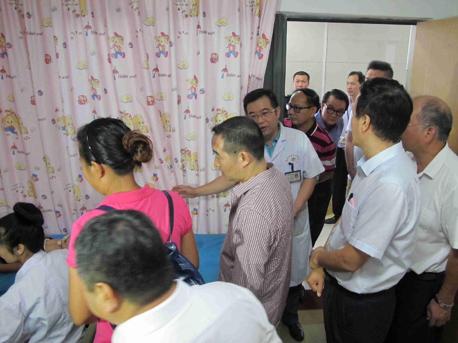 市三院心胸外科鐘衛(wèi)權(quán)主任向參觀領(lǐng)導(dǎo)介紹貧困先心病患者救治情況