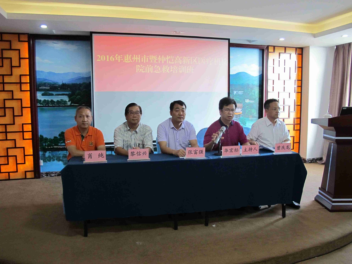 仲愷高新區(qū)宣教文衛(wèi)辦公室副主任華宏標(biāo)(右二)主持,惠州市120急救指揮中心張富強主任(右三),仲愷高新區(qū)宣教文衛(wèi)辦公室衛(wèi)生科曾慶龍科長(右一),市三院副院長、心血管醫(yī)學(xué)中心主任肖純博士(左一),香港圣約翰救護機構(gòu)救傷隊資深急救專家黎信興教授(左二)等出席