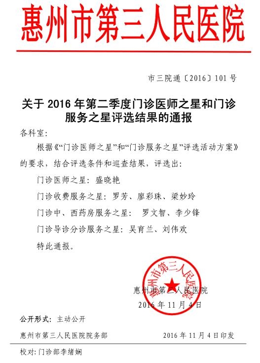 關(guān)于2016年第二季度門診醫(yī)師之星和門診服務(wù)之星評選結(jié)果的通報