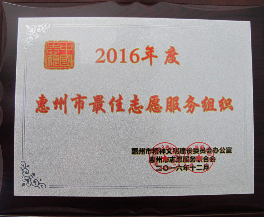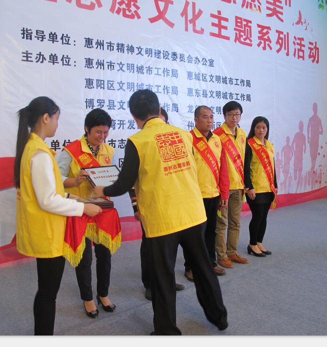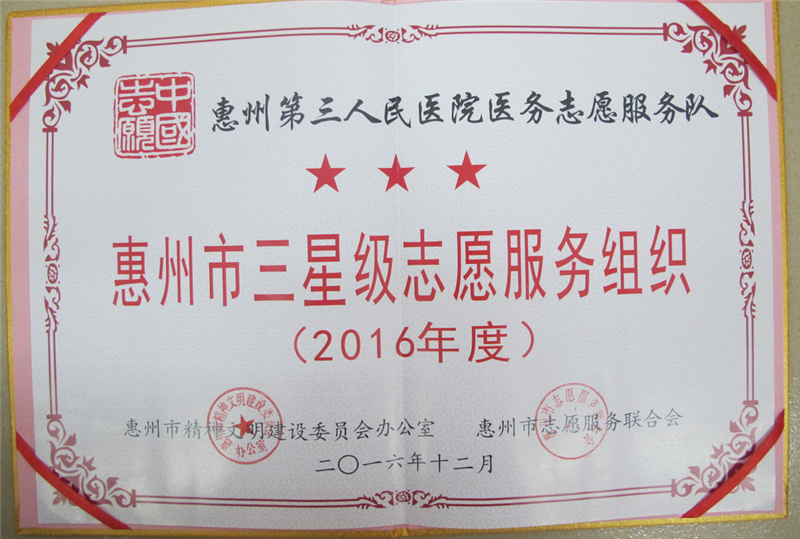 2016年12月4日上午,在2016年國際志愿者日來臨之際,2016年“中國夢·志愿美”惠州公益志愿文化主題系列活動啟動儀式在惠州市博物館舉行。會上,惠州市第三人民醫(yī)院志愿服務(wù)隊被授予“惠州市最佳服務(wù)組織”、“惠州市三星級志愿服務(wù)組織”榮譽稱號,耳鼻咽喉頭頸外科主任王豪被授予“惠州市最美志愿者”榮譽稱號。