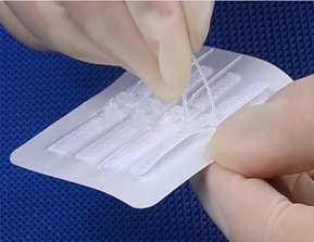 第四步:將《醫(yī)用縫合拉扣》兩端的膠帶部分準(zhǔn)確的貼放在傷口皮緣的兩邊。