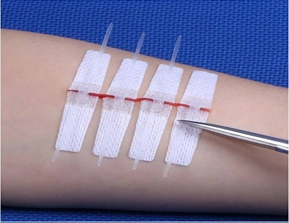 特別注意每組《醫(yī)用縫合拉扣》膠帶間距應(yīng)2—3mm。