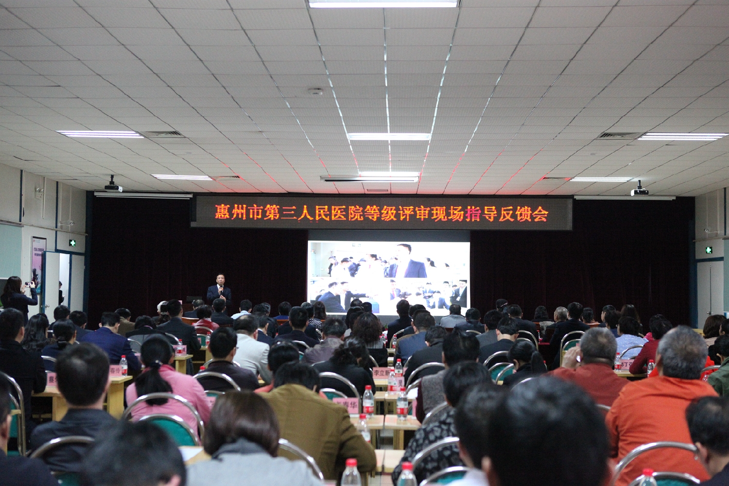 廣東省醫(yī)院管理評價質(zhì)控中心專家組,惠州市惠城區(qū)區(qū)委常委、常務副區(qū)長翟樹宇同志,惠州市衛(wèi)計局副局長黃宜志同志,惠城區(qū)衛(wèi)計局黨委書記、局長鄒忠平同志,惠州市第三人民醫(yī)院院長馬顯力、黨委書記鄧漢東同志等院領導班子成員及醫(yī)院中層干部,共200多人出席參加了本次反饋會。