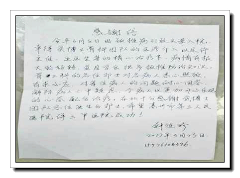 現(xiàn)在,鐘阿姨已經(jīng)康復(fù),馬上就要出院了。特的送來一封感謝信,信中寫道:今年3月8日因“頸椎病”引致頭暈入院,幸得武博士骨科團(tuán)隊(duì)的醫(yī)療介入以及許球祥、王鑫醫(yī)生等的精心治療下,病情有極大的好轉(zhuǎn),并且學(xué)會(huì)了很多頸椎病的防治知識(shí),骨二科的各位護(hù)士對(duì)病人悉心照顧,有求必應(yīng),對(duì)每一位的問題耐心回答,解除病人心中的焦慮,令病人以更加開心樂觀的心態(tài)配合治療。在此十分感謝武博士團(tuán)隊(duì)各位醫(yī)生與護(hù)士,希望惠州市第三人民醫(yī)院評(píng)“三甲”醫(yī)院成功。