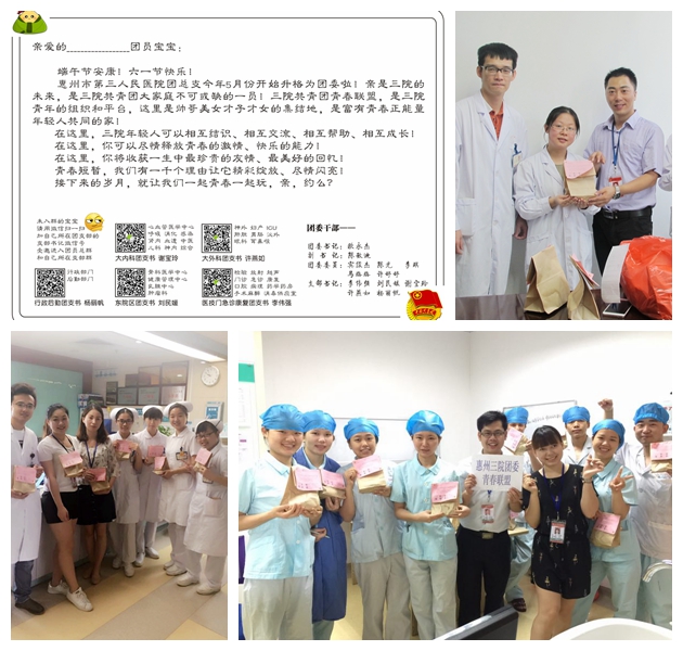 籍端午節(jié)和國際兒童節(jié)到來之際,為了慰藉辛勤工作的團員寶寶們,惠州市第三人民醫(yī)院團委經(jīng)過一個星期的精心籌備,展開了一場送粽子、送祝福的溫暖行動。5月30日和31日一大早,團員干部小分隊便兩兩結(jié)伴而行,提著精心準備的粽子、糖果和卡片來到各臨床科室,送到團員們的手中。對他們的神秘到來,團員們驚詫不已,卻頗為感動,流露出燦爛的笑容。這雖是小小禮物,卻飽含深情,承載著一份關(guān)懷一種掛念,也是一份祝福。