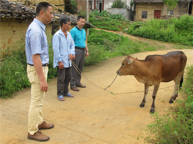 李助理和葉主任與貧困戶張運(yùn)強(qiáng)在交流黃牛的養(yǎng)殖經(jīng)驗(yàn)
