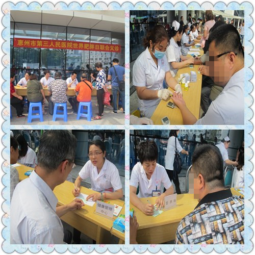 2017年5月11日,在國(guó)際肥胖日來(lái)臨之際,為幫助更多肥胖患者解決煩惱,促進(jìn)健康,惠州市第三人民醫(yī)院內(nèi)分泌科、營(yíng)養(yǎng)科、健康管理中心、肝病科舉辦多學(xué)科聯(lián)合義診活動(dòng),相關(guān)??漆t(yī)務(wù)志愿者在醫(yī)院本部門(mén)診廣場(chǎng)為群眾提供專家義診、健康咨詢、
