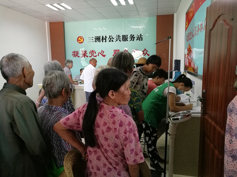 三洲村總?cè)丝趦汕в嗳?,以農(nóng)業(yè)人口為主,當(dāng)?shù)卮迕駥ρ獕?、血糖等相關(guān)知識十分缺乏。本次義診邀請三洲村65歲及以上的常住居民前來參加,地點設(shè)在三洲村村委會。義診團(tuán)隊為老人們提供生活方式和健康狀況評估、體格檢查、量血壓、測血糖、心電圖、白內(nèi)障篩查、骨病篩查等輔助檢查,并綜合??茖<业慕ㄗh,提出健康指導(dǎo)。