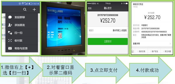目前,惠州三院所有門診收費(fèi)窗口、急診收費(fèi)窗口、健康管理中心收費(fèi)窗口均開通了此項(xiàng)微信掃碼支付服務(wù)?;颊呖蛇x擇任意結(jié)算模式,無(wú)論是自費(fèi)還是醫(yī)?;颊撸诖翱诮Y(jié)算付款時(shí),只要拿起手機(jī),打開微信,掃一掃二維碼,三秒鐘便可搞定繳費(fèi)。