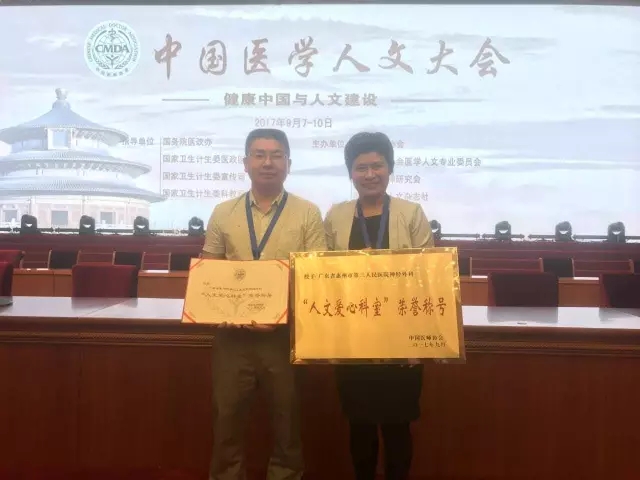 2017年9月7日-9日,以“健康中國與人文建設”為主題的中國醫(yī)學人文大會在北京開幕。惠州三院神經外科神經重癥負責人廖品君副主任醫(yī)師和服務管理部李林枝主任參加了此次大會并領回了由中國醫(yī)師協(xié)會和白求恩精神研究會授予的“人文愛心科室”牌匾和證書。