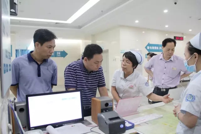 市衛(wèi)計局嚴(yán)戈科局長(中)、市衛(wèi)計局周麗副局長(左二)、惠城區(qū)衛(wèi)計局鄒忠平局長(左一)、市三院馬顯力院長(右二)聽取急診科護(hù)長介紹工作