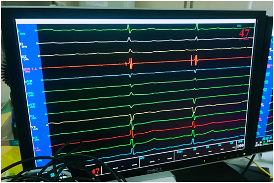 手術(shù)當(dāng)天,楊飛副主任醫(yī)師與鐘思干主任沉著冷靜、有條不紊實(shí)施著手術(shù),首次嘗試就成功穿刺腋靜脈,順利置入血管鞘,沿鞘管送入3830主動(dòng)電極至房室交界處房側(cè),順利找到his電位。