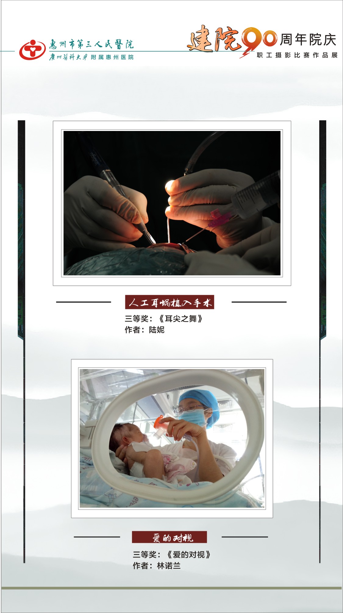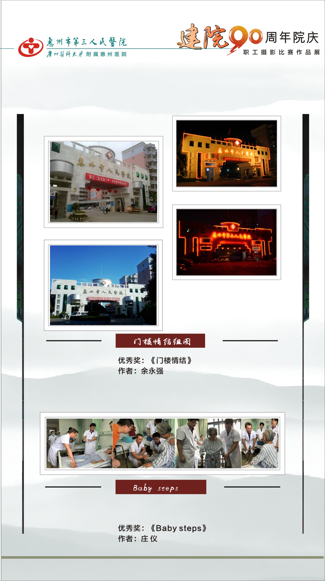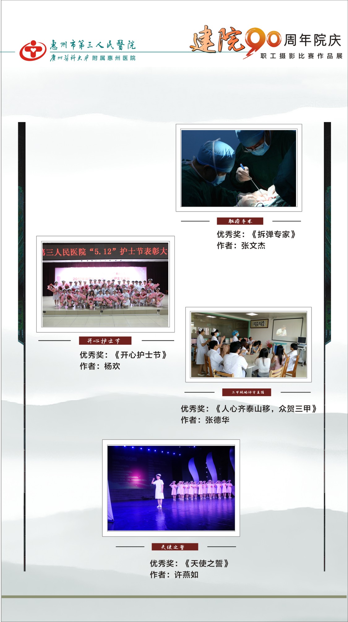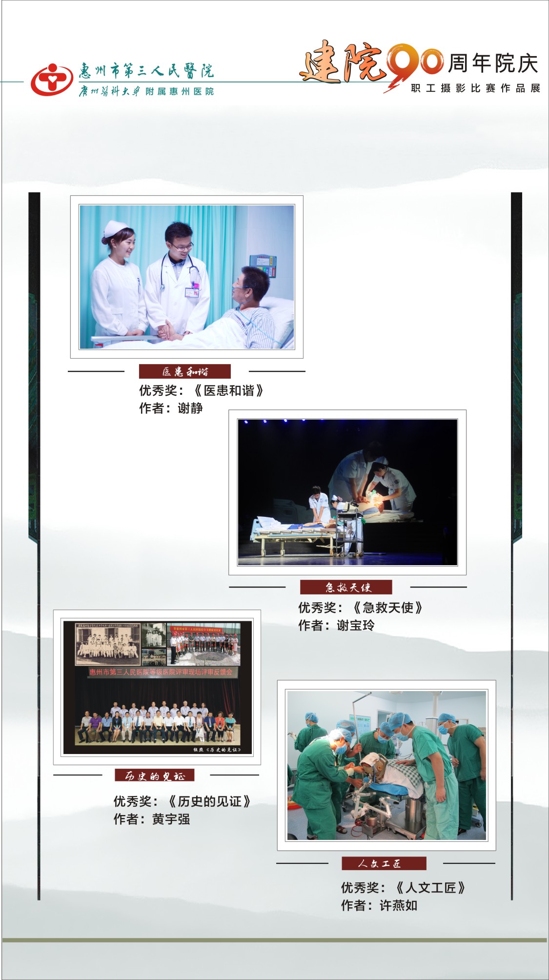 為慶祝90周年華誕,惠州市第三人民醫(yī)院于近期舉辦了院慶系列活動。其中,升旗儀式、學術(shù)活動周以及系列義診等活動的開展已獲得廣泛好評。而在上個月舉辦的職工書畫攝影比賽中,大批優(yōu)秀的作品如泉涌現(xiàn),充分展現(xiàn)出惠州三院職工人員的文藝風采!