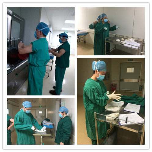 本次培訓(xùn)由手術(shù)室護(hù)士進(jìn)行現(xiàn)場操作演示,同時院感科倪玉娥主任和手術(shù)室梁雪景護(hù)士長對外科手消毒、穿無菌手術(shù)衣、無接觸式戴手套操作規(guī)范的要點(diǎn)以及需要注意的細(xì)節(jié)進(jìn)行了重點(diǎn)講解。最后,所有參加培訓(xùn)的醫(yī)生都進(jìn)行了現(xiàn)場操作。