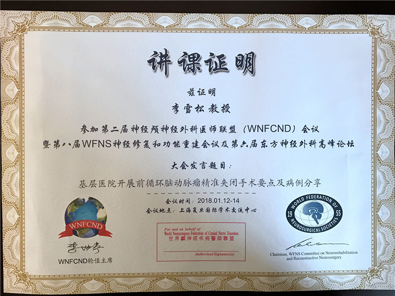 與會專家圍繞當今顱神經外科疾病診療領域新理念、新進展和新技術(如發(fā)病機制、顱神經電生理監(jiān)測技術、內鏡手術、多模態(tài)影像、3D打印、虛擬現(xiàn)實等)展開了精彩的交流和討論。會上,李雪松博士為大家分享的課題是“基層醫(yī)院開展前循環(huán)腦動脈瘤精準夾閉手術要點及病例分享”,受到專家們的好評與認可!