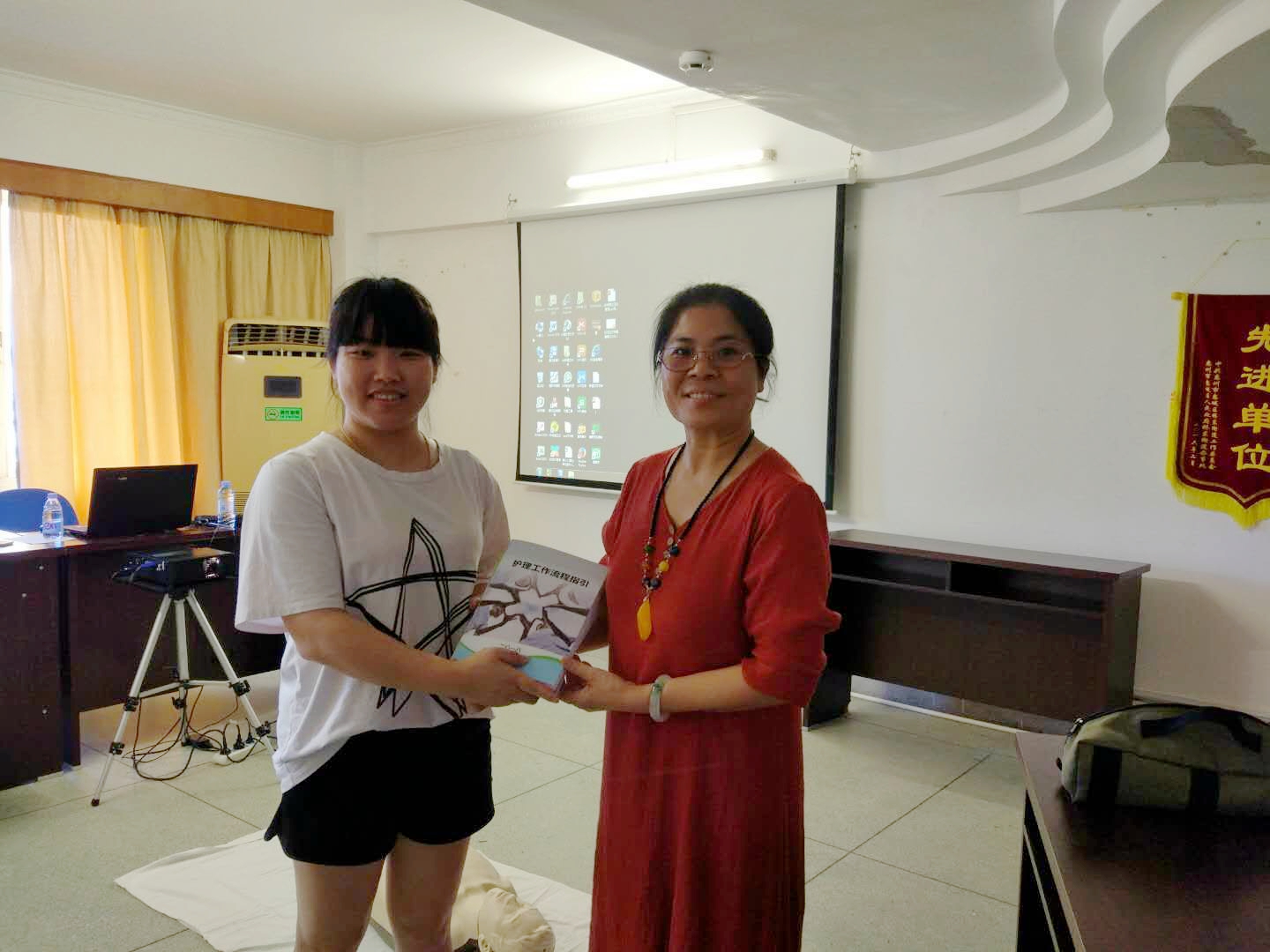 中心的醫(yī)護人員積極好學,認真聽講,課后還在陳偉花護士長手把手的指導下,進行了操作演練。