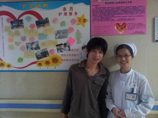 再看看住在31床的小朋友小晶,別說(shuō)他小,他已經(jīng)25歲,可是他在我眼中永遠(yuǎn)是像我的弟弟一樣可愛。記得初次見他時(shí),一個(gè)人,背著背包,拿著工傷證明來(lái)我科住院,背影十分落寞。我想,如果我們醫(yī)院沒有成為工傷定點(diǎn)醫(yī)院的話,也許就不會(huì)遇上這個(gè)孩子。他的手在工作時(shí)被機(jī)器所傷,獨(dú)自一人來(lái)到我院,沒人親人在旁陪伴的日子一定是很難受吧,放心,以后這里就是你的家,我們護(hù)士就是你的姐姐,你的家人,陪伴著你渡過(guò)這段艱難的日子!