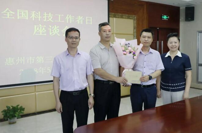 惠州市科協(xié)學(xué)術(shù)部周惠玲部長向武明鑫博士致以全國科技工作者日節(jié)日問候