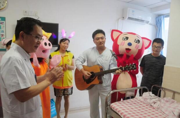 下午三點左右,志愿者們來到兒科二區(qū),集體探望了一位重病初愈的9歲男孩,為鼓勵他早日恢復健康?;葜萑喝宋膼坌乃囆g(shù)團的王亞威護士大哥哥為他吉他彈唱了一首《陽光總在風雨后》。兒科二區(qū)黃海忠主任也帶領(lǐng)醫(yī)護人員一起為孩子加油鼓勁,現(xiàn)場非常溫馨感人。