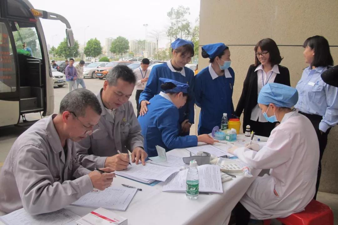 工作人員給獻(xiàn)血的職工們測量血壓、測量心率、詢問體重并進(jìn)行采血樣的檢測