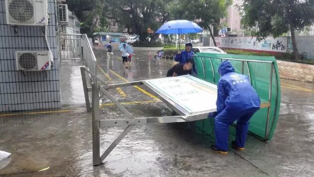 院本部6號(hào)樓及營養(yǎng)科門口的兩個(gè)不銹鋼宣傳欄,體積較大且招風(fēng),容易被臺(tái)風(fēng)吹倒,為防止不銹鋼宣傳欄吹倒砸傷人,保安人員主動(dòng)將宣傳欄放倒,并做好警示。
