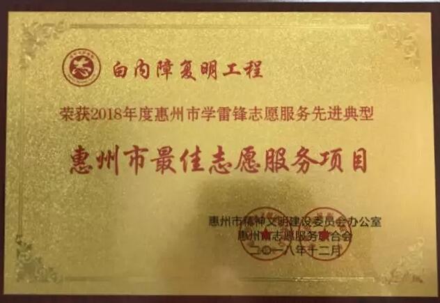 惠州市第三人民醫(yī)院“白內(nèi)障復(fù)明工程”項目榮獲2018年惠州市“最佳志愿服務(wù)項目”。