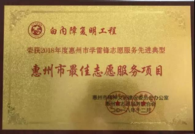 惠州市第三人民醫(yī)院“白內(nèi)障復(fù)明工程”項(xiàng)目榮獲2018年惠州市“最佳志愿服務(wù)項(xiàng)目”。