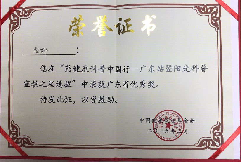 經(jīng)過激烈的角逐,惠州三院參賽選手龍娜榮獲“藥健康科普中國(guó)行——廣東站暨陽(yáng)光科普宣教之星選拔”的優(yōu)秀獎(jiǎng)!
