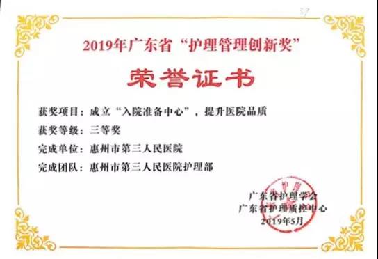 此前,經(jīng)各地市護(hù)理學(xué)會(huì)、各醫(yī)療機(jī)構(gòu)評(píng)選推薦,評(píng)選專家初評(píng)、終評(píng)等環(huán)節(jié),最終評(píng)出各項(xiàng)獎(jiǎng)項(xiàng)。惠州市第三人民醫(yī)院的“入院準(zhǔn)備中心”項(xiàng)目在300多個(gè)項(xiàng)目中脫穎而出,喜獲“廣東省護(hù)理行政管理創(chuàng)新獎(jiǎng)”三等獎(jiǎng)!