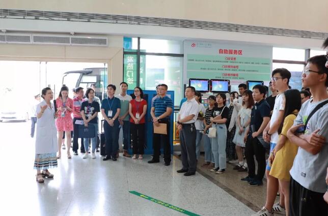 座談會后, 70余名高校學(xué)生到惠州三院進行了實地參觀。本次參觀活動從門診一樓前線服務(wù)中心開始,由門診辦李緒嫻主任介紹了惠州三院的門診及智慧醫(yī)療情況后沿醫(yī)療主街到達健康大講堂,然后集中觀看醫(yī)院90周年宣傳片和聽取醫(yī)院二期工程介紹。