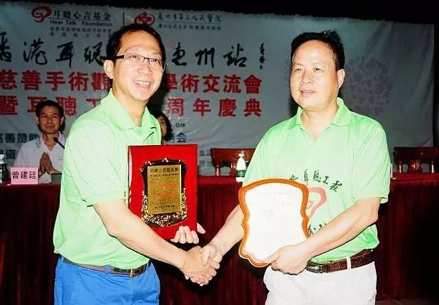 耳聰工程惠州站成立,國際知名耳科專家香港中文大學(xué)唐志輝教授和惠州市第三人民醫(yī)院馬顯力院長分別代表耳聽心言基金會和醫(yī)院互相贈送了紀(jì)念品