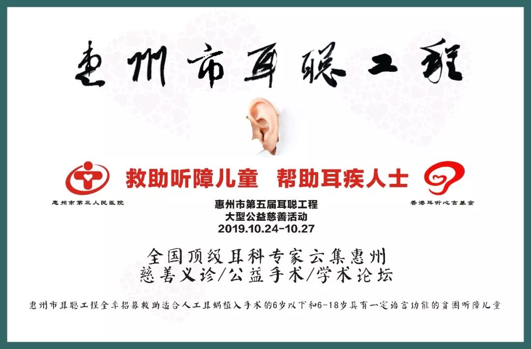 2019年10月24日至27日,惠州市第五屆耳聰工程活動(dòng)將于惠州市第三人民醫(yī)院舉行,為更多聽障兒童將開啟有聲世界,更多耳疾患者將重獲健康!我們熱切期盼您的到來,匯合大家之善心善行,讓一年一度的耳聰工程持續(xù)給患者帶去幸福,讓公益慈善正能量持續(xù)為生命帶去希望,讓慈悲持續(xù)感動(dòng)社會(huì),讓大愛持續(xù)溫暖人間!